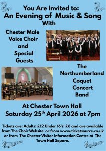 Chester Male Voice Choir will be joined at Chester Town Hall by special guests Coquet Concert Band from Northumberland for the event which takes place on Saturday 25th April at 7.00pm.